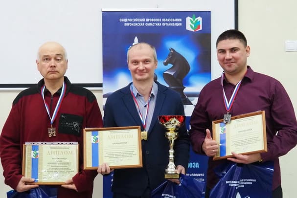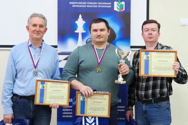 Финал VII регионального шахматного турнира на Кубок Воронежской областной организации Общероссийского Профсоюза образования. Тройка лидеров среди мужчин в первой лиге: А.В. Гринько, Е.А. Елисеев, Л.Ю. Кононов.