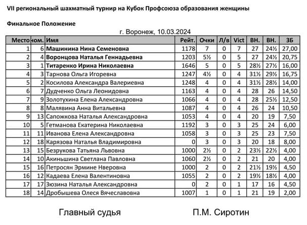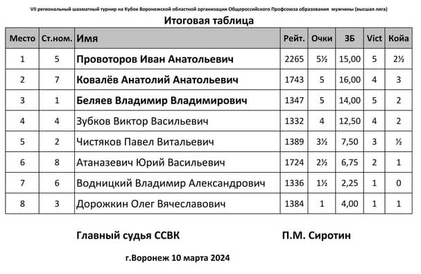 В Воронежском областном шахматном клубе 10 марта прошел финал VII регионального шахматного турнира на Кубок Воронежской областной организации Общероссийского Профсоюза образования. Победителями среди мужчин стали: в высшей лиге – начальник отдела подготовки и аттестации научно-педагогических кадров кафедры цифровой и отраслевой экономики факультета экономики, менеджмента и информационных технологий Воронежского государственного технического университета (ВГТУ), профессор, доктор экономических наук Иван Провоторов, в первой лиге – педагог дополнительного образования Центра инженерных компетенций детей и молодежи «Кванториум» (Воронеж, Левобережный район) Евгений Елисеев. Первое место среди женщин заняла тренер-преподаватель по легкой атлетике Аннинской спортивной школы Нина Машинина.
