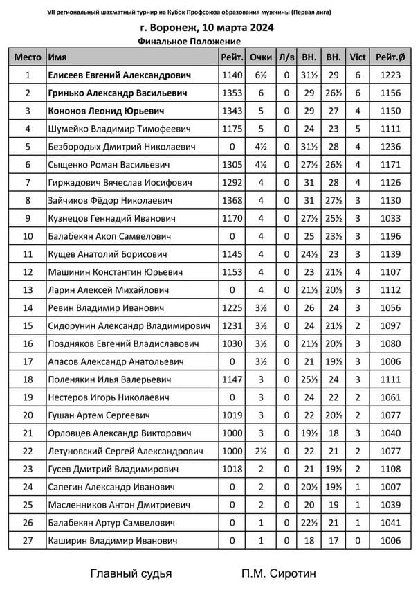 Призеры среди мужчин в первой лиге: педагог дополнительного образования Павловской средней школы с углубленным изучением отдельных предметов Александр Гринько – II место, учитель по шахматам средней школы № 73 Воронежа (Советский район) Леонид Кононов – III место.