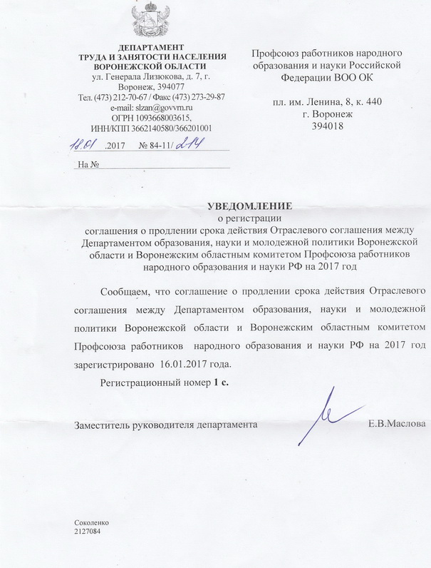 Продление срока действия (на 2017 год) Отраслевого соглашения между департаментом образования, науки и молодёжной политики Воронежской области и Воронежским областным комитетом Профсоюза работников народного образования и науки РФ на 2014-2016 годы