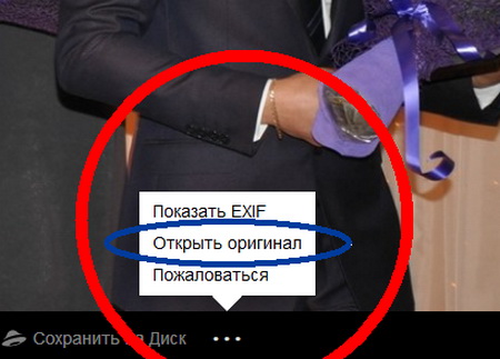 Левой клавишей мыши нажмите кнопку «троеточие» (на вышестоящей фотографии эта область выделена красным кругом и стрелкой). После того, как появится всплывающее меню, выберите в нем средний вариант «Открыть оригинал» (на нижеследующей фотографии выделено синим овалом):