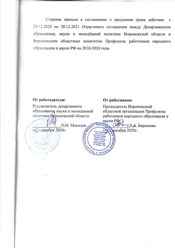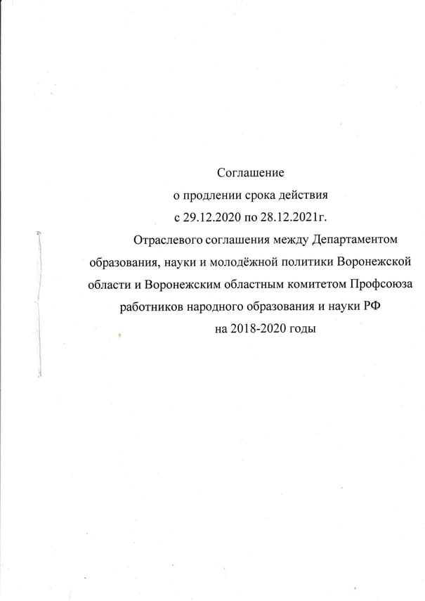 Продление срока действия (на 2021 год) Отраслевого соглашения между департаментом образования, науки и молодёжной политики Воронежской области и Воронежской областной организацией Профсоюза работников народного образования и науки РФ на 2018-2020 годы