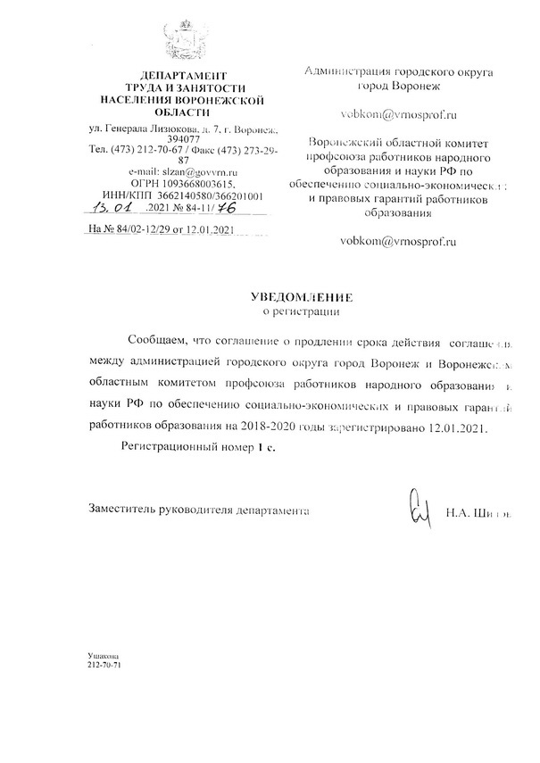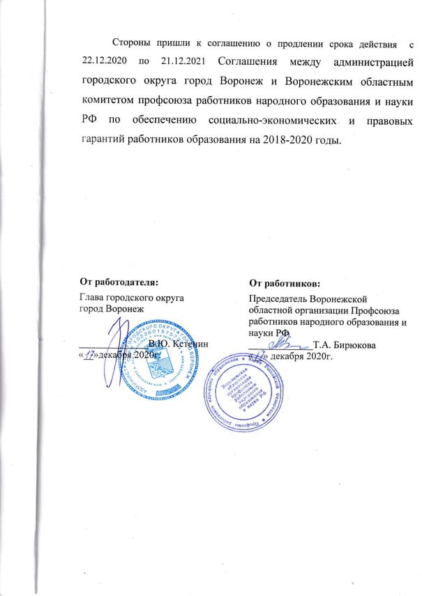 Продление срока действия (на 2021 год) Соглашения между администрацией городского округа город Воронеж и Воронежским областным комитетом профсоюза работников народного образования и науки РФ по обеспечению социально-экономических и правовых гарантий работников образования на 2018 – 2020 годы