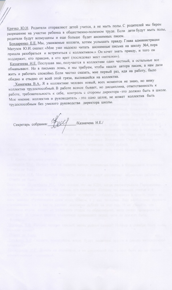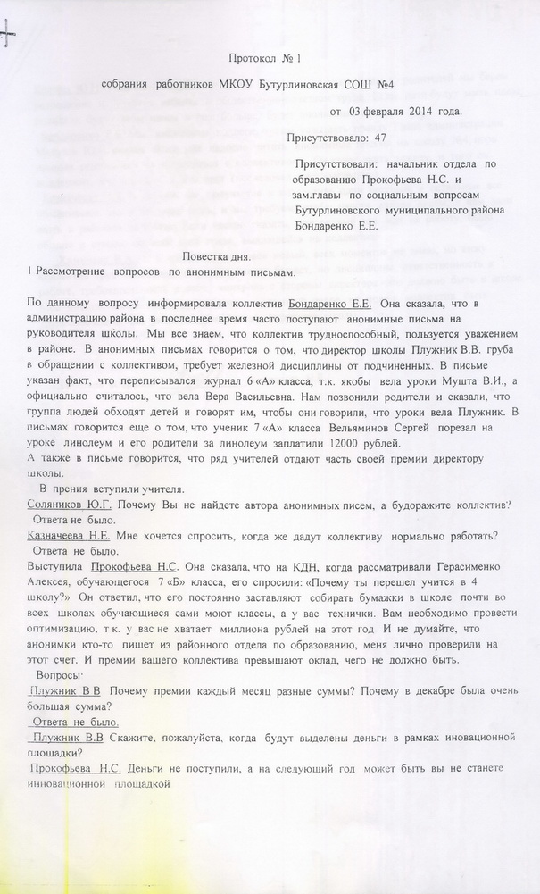 Собрание провели заместитель главы администрации района, она же секретарь местного отделения партии «Единая Россия» Евдокия Бондаренко и руководитель отдела по образованию и молодежной политике Наталья Прокофьева. В повестке дня только один пункт: «Рассмотрение вопросов по анонимным письмам». Далее в протоколе отражено: Бондаренко проинформировала собравшихся о поступающих в последнее время в администрацию района анонимных письмах, в которых говорится о том, что Плужник груба в отношениях с коллективом, что ряд учителей отдают ей часть своей премии, что вместо нее уроки ведет другой учитель и так далее и тому подобное.