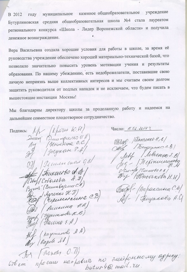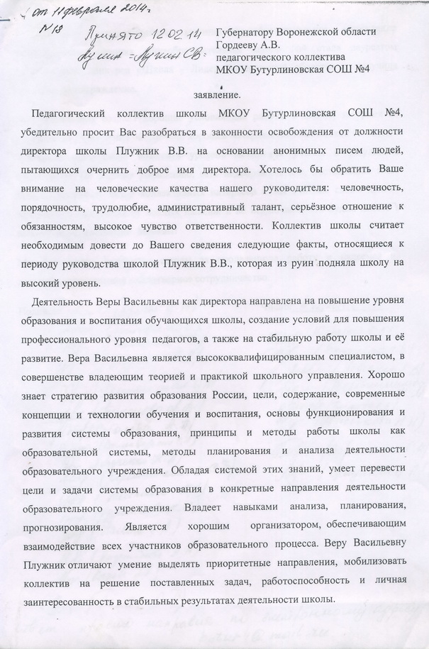 «Педагогический коллектив МКОУ Бутурлиновская СОШ № 4 убедительно просит Вас разобраться в законности освобождения от должности директора школы Плужник В.В. на основании анонимных писем людей, пытающихся очернить доброе имя директора. Хотелось бы обратить Ваше внимание на человеческие качества нашего руководителя: порядочность, трудолюбие, административный талант, серьезное отношение к обязанностям, высокое чувство ответственности. Коллектив школы считает необходимым довести до Вашего сведения следующие факты, относящиеся к периоду руководства школой Плужник В.В.,которая из руин подняла школу на высокий уровень.