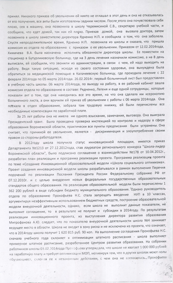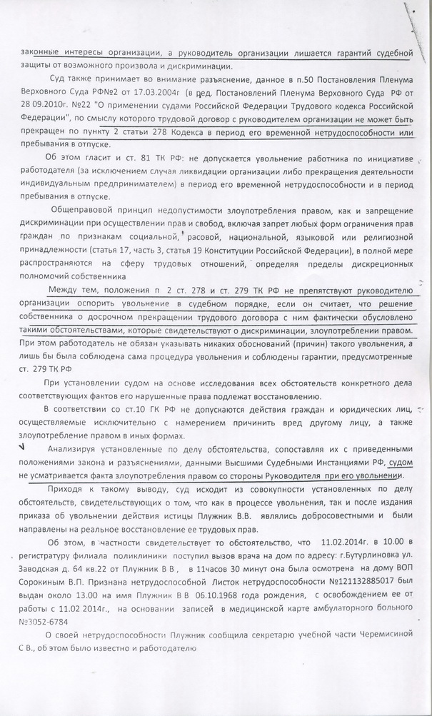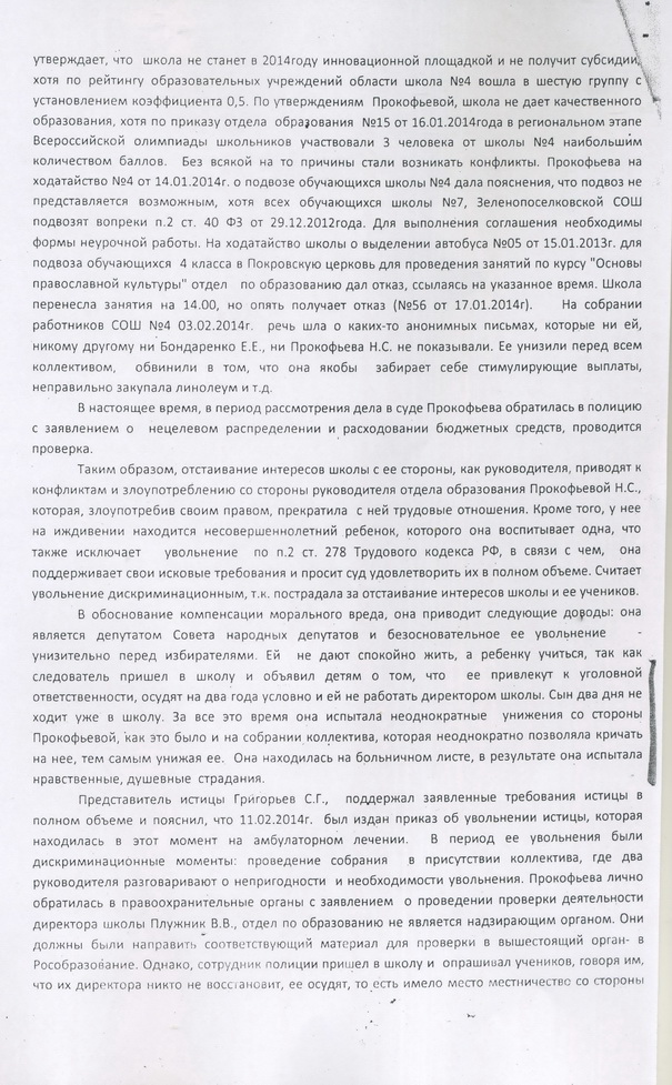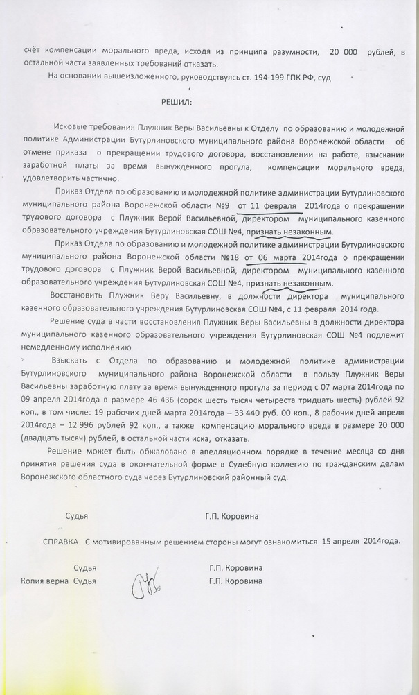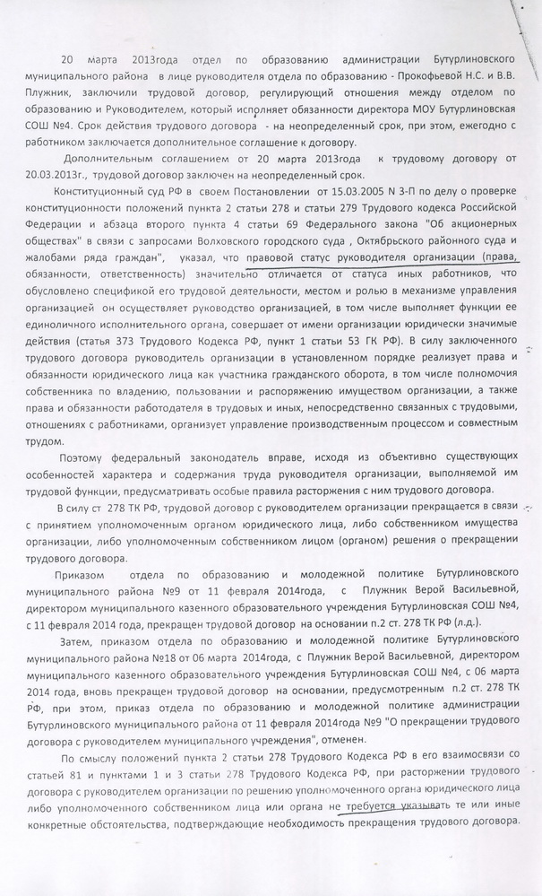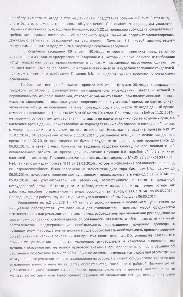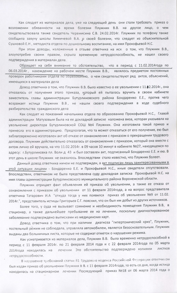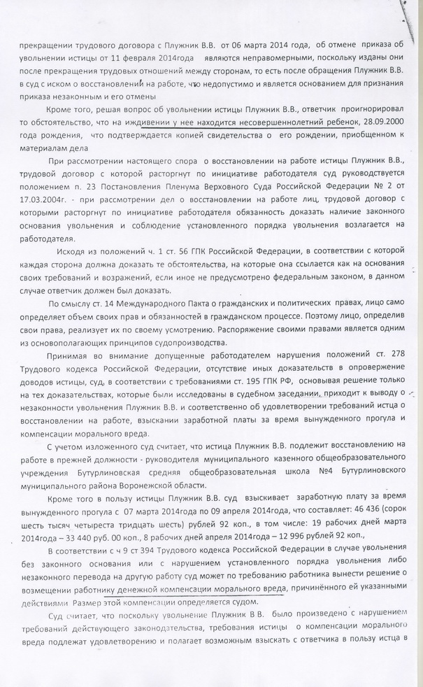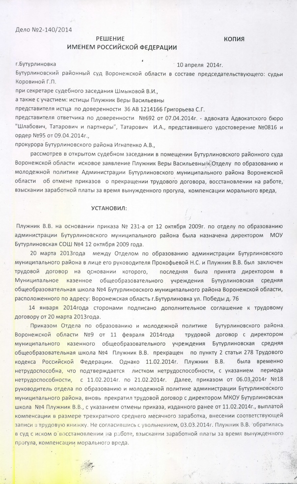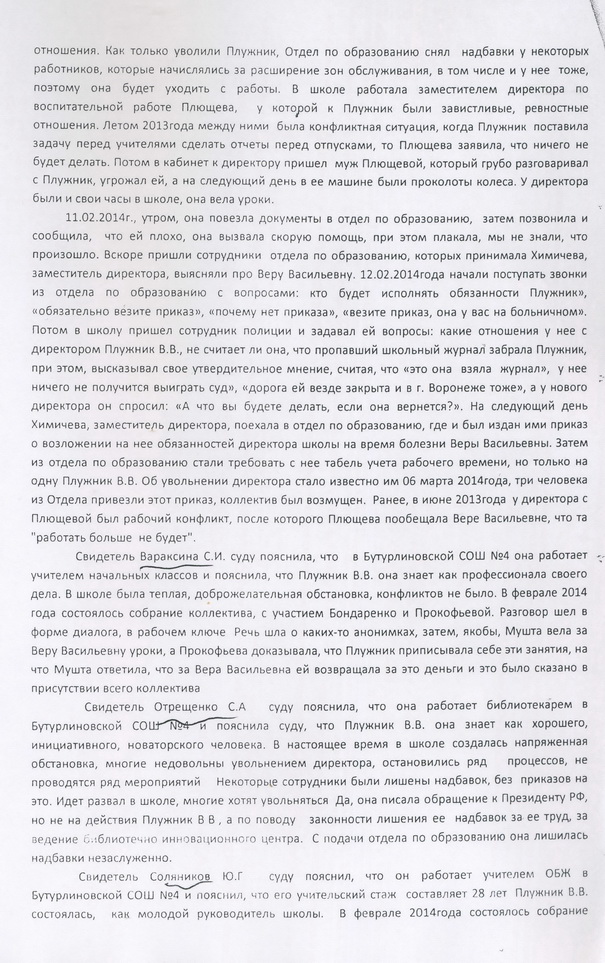«…Прокофьева Н.С., являющаяся начальником отдела по образованию и молодежной политике администрации Бутурлиновского муниципального района Воронежской области, суду сообщила, что ею была составлена докладная записка на имя главы администрации Бутурлиновского района Матузова на предмет поступавших в отдел анонимных писем на работу директора Бутурлиновской СОШ № 4 Плужник В.В. Главой администрации Матузовым была на ее докладной записке наложена виза, которая указывала на увольнение директора Бутурлиновской СОШ № 4 Плужник»…
