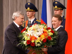 Полномочный представитель президента РФ в ЦФО Георгий Полтавченко поздравляет губернатора Воронежской области Алексея Гордеева с вступлением в должность.