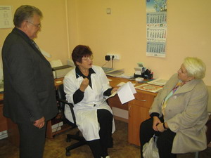 Главный врач МУЗ ГО г. Воронежа «ГП № 15 (студенческая)» В.И. Муратов, врач-рефлексотерапевт Г.И. Ильина, председатель Воронежского обкома профсоюза Т.А. Бирюкова. Фото: Людмилы Тореевой. |